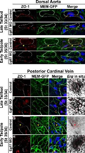 Fig 6. EGFL7 is required for proper reorganization of tight junctions.(A-H). Representative confocal images of transverse sections of the dorsal aorta (DA) and posterior cardinal veins (PCV) stained with ZO-1 (red), GFP to mark cell membranes (MEM-GFP; green), and DAPI to mark nuclei (blue). Phase contrast images for the PCVs represent the Erg in situ signal. All images taken at 63x magnification with scale bars indicating 20 μm. Dotted white and red lines in all panels delineate the endothelial cells comprising each vessel. As anatomical references, the hypochord in (A-D) and the kidney in (E-H) are indicated by solid white lines. (A). ZO-1 localizes to tight junctions between endothelial cells of the DA in late tailbud stage (stage 33/34) control embryos. (B). ZO-1 tight junctions between endothelial cells of the DA in late tailbud stage (stage 33/34) EGFL7-depleted embryos appear similar to controls. (C). Tight junctions are redistributed to distinct puncta between endothelial cells at the periphery of the lumen in early tadpole stage (stage 35/36) control embryos. (D). Tight junctions are retained between endothelial cells of the DA in early tadpole stage (stage 35/36) EGFL7-depleted embryos. (E). Tight junctions assemble along the cord center between endothelial cells of the PCV in late tailbud stage (stage 33/34) control embryos. (F). Similar to controls, tight junctions assemble between adjacent endothelial cells of the PCV in late tailbud stage (stage 33/34) EGFL7-depleted embryos. (G). Tight junctions are redistributed to the periphery of the lumenized PCV and appear as distinct points of cell-cell contact in early tadpole stage (stage 35/36) control embryos. (H). Tight junctions are retained along the cord center of the PCV in early tadpole stage (stage 35/36) EGFL7-depleted embryos. 3â4 embryos from each condition/stage were assessed from at least 3â4 independent injection batches at the same position along the anterior-posterior axis of the embryo. |