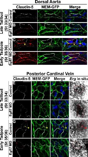 Fig 7. EGFL7 is required for junctional reorganization but not for the hierarchical assembly of tight junctions.(A-H). Representative confocal images of transverse sections of the dorsal aorta (DA) and posterior cardinal veins (PCV) stained with Claudin-5 (red), GFP to mark cell membranes (MEM-GFP; green), and DAPI to mark nuclei (blue). Phase contrast images for the PCVs represent the Erg in situ signal. All images taken at 63x magnification with scale bars indicating 20 μm. Dotted white and red lines in all panels delineate the endothelial cells comprising each vessel. As anatomical references, the hypochord in (A-D) and the kidney in (E-H) are indicated by solid white lines. (A-B). Claudin-5 expression is absent from endothelial cells of the DA in late tailbud stage (stage 33/34) control and EGFL7-depleted embryos. (C). Claudin-5 localizes to tight junctions between endothelial cells once the DA lumen has formed in early tadpole stage (stage 35/36) control embryos. (D). Claudin-5 expression is apparent in tight junctions between EGFL7-depleted endothelial cells of the DA despite failed lumen formation at early tadpole stage (stage 35/36). (E-F). Claudin-5 expression is absent from endothelial cells of the PCV in late tailbud stage (stage 33/34) control and EGFL7-depleted embryos. (G). Claudin-5 localizes to distinct tight junctions between endothelial cells around the periphery of the PCV lumen in early tadpole stage (stage 35/36) control embryos. (H). Claudin-5 localizes to tight junctions along endothelial cell contacts within the PCV of early tadpole stage (stage 35/36) EGFL7-depleted embryos. 3â4 embryos from each condition/stage were assessed from at least three independent injection batches at the same position along the anterior-posterior axis of the embryo. |