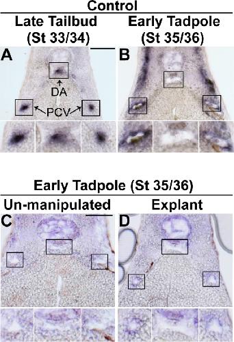 Fig 1. Vascular lumen formation proceeds independently of circulation in Xenopus.(A-B). In situ hybridization with endothelial-specific Erg followed by sectioning was performed to determine the time course of vascular lumen formation of the dorsal aorta (DA) and posterior cardinal veins (PCV) in Xenopus. (A). Endothelial cells are coalesced together at the correct positions of the DA and PCVs in late tailbud stage (stage 33/34) control embryos. (B). Lumenized DA and PCVs become apparent by early tadpole stage (stage 35/36) in control embryos. 3â4 embryos from each condition/stage were assessed from at least three independent injection batches at the same position along the anterior-posterior axis of the embryo. (C-D). In situ hybridization with Erg followed by sectioning. (C). Transverse section of an early tadpole stage (stage 35/36) wildtype embryo depicting lumenized DA and PCVs. (D). Following the removal of the anterior and heart of early tailbud embryos, explants were cultured until early tadpole stage (stage 35/36) and processed as indicated above. PCV and DA lumens readily form in the absence of a functioning heart or circulatory system. 3â4 embryos from each condition were assessed from two independent experiments. Top image of each panel was taken at 20x magnification. Black boxes correspond to enlarged images of each vessel displayed below. Scale bars represent 20 μm. |