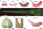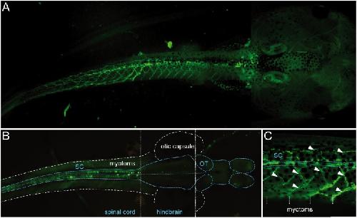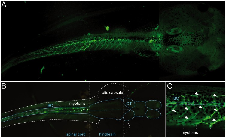 Fig 5. Most of the fluorescence visible in transgenic uts2b-GFP X. laevis tadpoles occurs in cells located in the spinal cord and in motor axon projections.A. GFP fluorescence imaging of a representative transgenic tadpole at stage 58. The tail is seen in lateral view while the head is seen in dorsal view. B. GFP expression at the level of a dissected and opened whole-mount CNS of a stage 50 transgenic tadpole. The CNS was optically exposed by removing the dorsal part of the tail and the top of the head. Note that GFP+ cells are restricted to the spinal cord. Dorsal view, rostral to the right. C. Detail of A showing GFP+ motor axon projections (arrowheads) extending towards axial musculature. White dashed vertical lines indicate myotome boundaries. SC, spinal cord. OT, optic tectum.