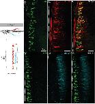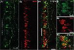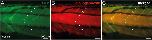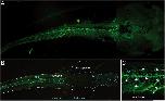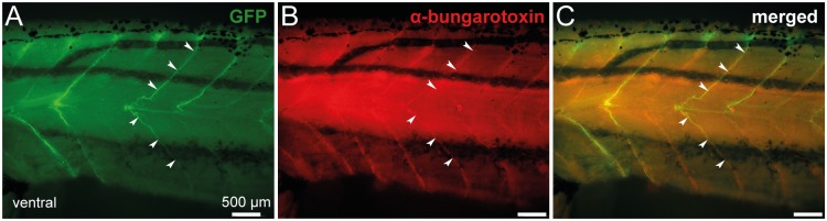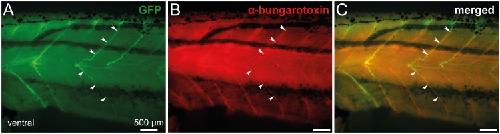 Fig 8. Spinal GFP+ axon motor projections of transgenic uts2b-GFP X. laevis tadpoles co-localize with α-bungarotoxin, a marker of postsynaptic neuromuscular junctions.Combined fluorescence of GFP (A) and immuno-labeling of α-bungarotoxin (B) at the level of spinal axon motor projections in a whole-mount stage 57 transgenic tadpole. C. Merged image obtained when GFP fluorescence and α-bungarotoxin staining were superimposed. Postsynaptic nicotinic acetylcholine receptors labeled by α-bungarotoxin and GFP+ motor neuron axons overlap (arrowheads). Lateral views, rostral to the left.