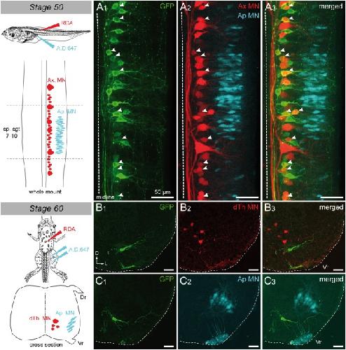 Fig 9. Spinal GFP+ cells of transgenic uts2b-GFP X. laevis tadpoles project to tail myotomes.Confocal image of combined immuno-labeling of spinal GFP+ neurons (A1) and retrograde labeling of spinal motoneurons (A2) in a stage 50 uts2b-GFP tadpole whole-mount spinal cord preparation. A3. Merged image obtained when GFP staining and retrograde labeling were superimposed. Dorsal view with rostral up. Only the hemi-cord is shown. The dashed-line on the right side represents the midline. Axial motoneurons (Ax MN) innervating myotomes were labeled from tail muscles with rhodamine (RDA) dextran dye whereas appendicular motoneurons (Ap MN) innervating limbs were labeled from hindlimb buds with alexa dextran 647 dye (A.D. 647; see scheme on the left panel). The drawing at the top left panel illustrates the medio-lateral localization of Ax MN and developing Ap MN in larval spinal cord at stage 50. Yellow arrowheads indicate double stained cells. Cross-section confocal image of combined immuno-labeling of spinal GFP+ neurons (B1, C1) and retrograde labeling of dorsal thoracic motoneurons (dTh MN, B2) and Ap MN, (C2) in stage 60 metamorphosing uts2b-GFP tadpole. B3, C3. Merged images obtained GFP staining and retrograde labeling were superimposed. dTh MN were labeled from dorsalis trunci muscles with RDA whereas Ap MN were labeled from groups of extensor and flexor of the hindlimb with A.D. 647 (see scheme on the left side). The cross-section drawing at the bottom left panel illustrates the dorso-ventral localization of dTh MN and Ap MN in the future adult spinal cord at stage 60. sp.sgt 7â10, spinal segments 7 to 10, Vr, ventral root. D, dorsal; L, lateral.