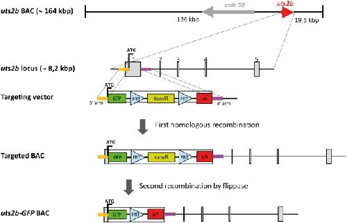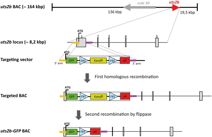 Fig 1. Strategy for constructing the recombinant uts2b BAC containing uts2b-EGFP expression cassette.The X. tropicalis uts2b BAC clone, ALNOAAA14YB24, contains approximately 164 kbp genomic DNA. The uts2b gene is approximately 8.2 kbp long as represented by a red arrow, and it comprises 5 exons. The targeting vector was designed to contain two uts2b genomic DNAs on its either side (denoted 5â- and 3â-arms), that allows a specific homologous recombination between the targeting vector and the uts2b BAC DNA at the genomic region surrounding the first exon. Homology arms for the first exon of uts2b were ligated to both ends of an EGFP.FRT-Promotor Bacterial Minimal.kanamycin-FRT.2pA expression cassette. Through the first homologous recombination, the expression cassette was inserted in place of the first uts2b exon in the uts2b BAC clone. Then, the kanamycin resistance cassette was selectively eliminated by expressing Flipase, leading to the uts2b-EGFP BAC clone containing only the EGFP cDNA expression cassette under control of the uts2b promoter. Finally, note that the ccdc50 gene, located close to the uts2b locus, was deleted from the uts2b BAC to avoid possible artifacts due to its overexpression (not shown).