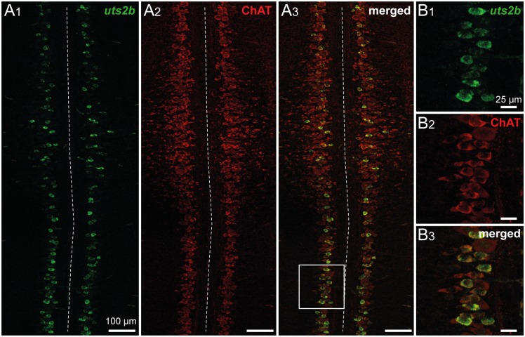 Fig 3. Spinal uts2b+ cells are cholinergic neurons in X. laevis tadpoles.Confocal images of combined fluorescent in situ hybridization of uts2b mRNA (A1, B1) and ChAT immunolabeling (A2, B2) in a whole-mount dissected and opened spinal cord preparation of stage 50 wild type tadpole. A3, B3. Merged image obtained when uts2b and ChAT stainings were superimposed. Dorsal view with rostral up. Note that in this preparation, the more ventral structures are close to the midline (dashed line). The boxed region in A3 is shown at higher magnification in B1âB3.