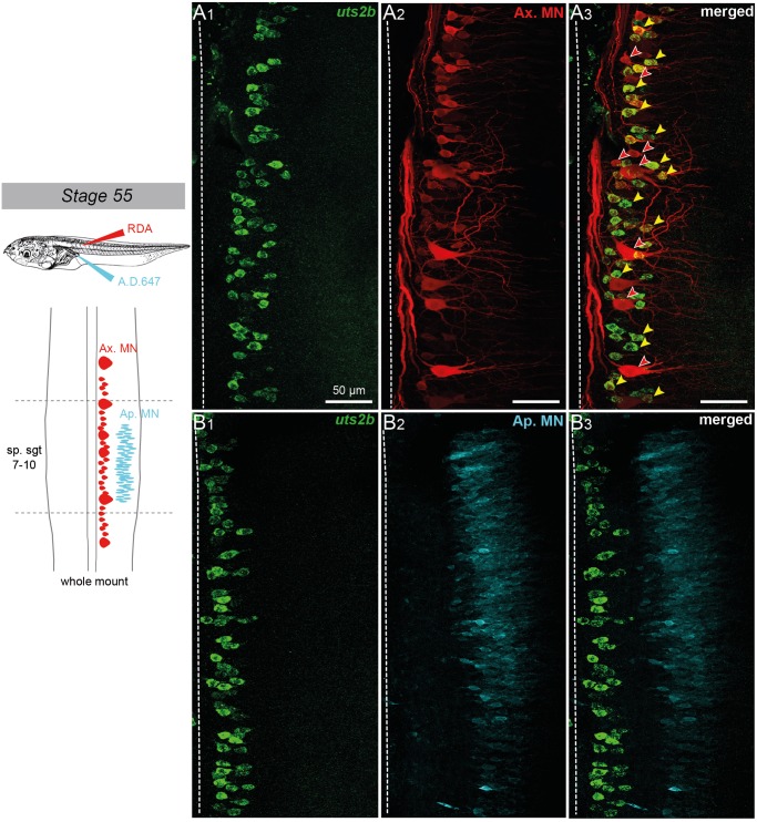 Fig 4. Spinal uts2b+ cells of X. laevis tadpoles project to tail myotomes.Confocal image of combined fluorescent in situ hybridization of uts2b mRNA (A1, B1) and retrograde labeling of spinal axial (A2) and appendicular (B2) motoneurons in stage 55 tadpole whole-mount spinal cord preparations. A3, B3. Merged images of uts2b staining and retrograde labeling. All images display dorsal view of hemi-cords, with the rostral side up (dashed-line on the left indicates the midline). Axial motoneurons (Ax MN) were labeled with rhodamine dextran dye (RDA) injected into tail myotomes while appendicular motoneurons (Ap MN) were labeled from posterior leg muscles with Alexa Dextran 647 dye (A.D. 647; see upper scheme on the left panel). The drawing on the left panel illustrates the localization of Ax MN and developing Ap MN in larval spinal cord at stage 55. Yellow arrowheads indicate double stained cells. Red arrowheads indicate uts2bâretrograde labeled cells. sp.sgt 7â10, spinal segments 7 to 10.