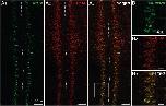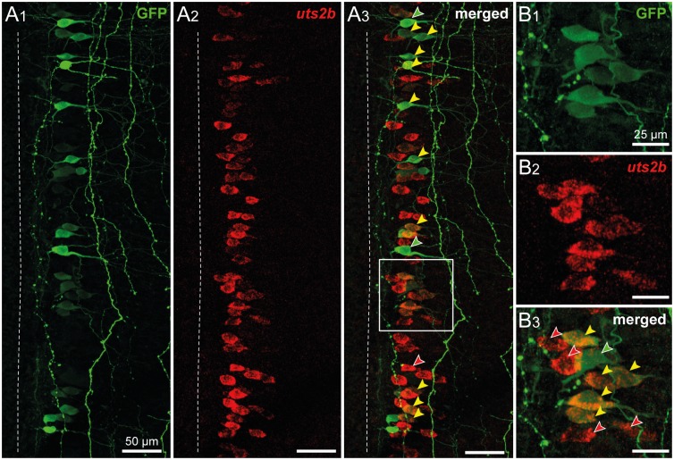 Fig 6. The uts2b expression pattern is partially reproduced by GFP in transgenic uts2b-GFP X. laevis tadpoles.Confocal images of combined immuno-labeling of GFP+ neurons (A1, B1) and fluorescent in situ hybridization of uts2b mRNA (A2, B2) in a whole-mount spinal cord preparation of stage 50 uts2b-GFP tadpole. A3, B3. Merged image obtained when GFP and uts2b stainings were superimposed. Dorsal view with rostral up. Only the hemi-cord is shown. The dashed-line on the left side represents the midline. Note that in this preparation, the more ventral structures are closer to the midline. The boxed region in A3 is shown at higher magnification in B1âB3. Yellow arrowheads denote cells that express both GFP and uts2b. Red arrowheads designate uts2b+/GFPâ cells and green arrowheads designate uts2bâ/GFP+ cells.