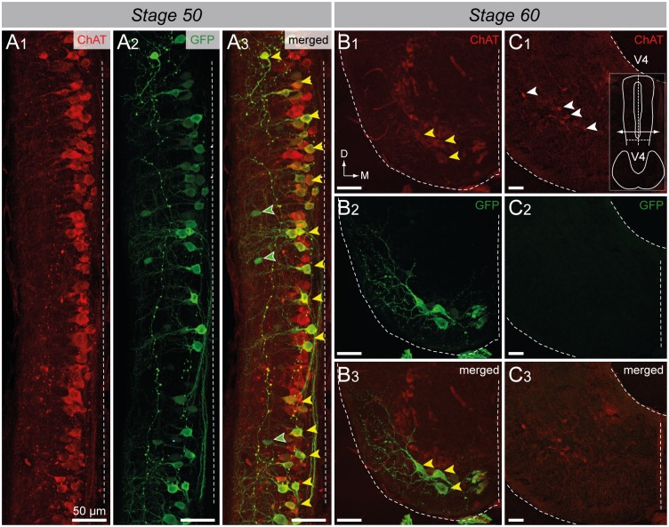 Fig 7. Spinal GFP+ cells of transgenic uts2b-GFP X. laevis tadpoles mainly express ChAT.Confocal images of combined immuno-labeling of ChAT+ (A1) and GFP+ (A2) neurons in a whole-mount spinal cord preparation of stage 50 transgenic tadpole. A3. Merged image obtained when ChAT and GFP stainings were superimposed. Dorsal view with rostral up. Only the hemi-cord is shown. The dashed-line on the right side represents the midline. Note that in this preparation, the more ventral structures are closer to the midline. Confocal images of combined immuno-labeling of ChAT+ (B1âC1) and GFP+ (B2âC2) neurons in lumbar spinal cord (B) and brainstem (C) cross-sections of stage 60 uts2b-GFP tadpoles. B3, C3. Merged images obtained when ChAT and GFP stainings were superimposed. The cross-section in C1â3 originates from the caudal hindbrain (rhombomeres 7â8) where IX-XI motor nuclei are located. Yellow arrowheads designate GFP+/ChAT+ cells; green arrowheads designate GFP+/ChATâ cells; White arrowheads designate GFPâ/ChAT+ cells. D, dorsal; M, medial; V4, 4th ventricule.