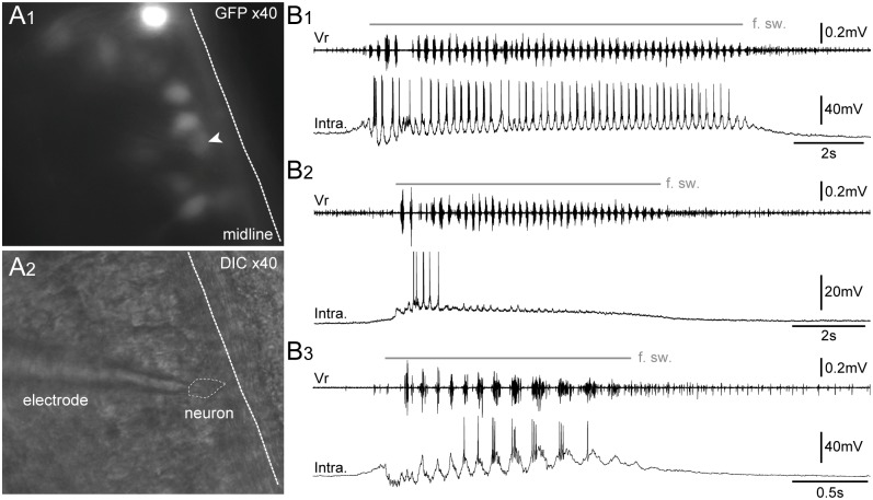 Fig 10. GFP+ cells exhibit a typical pattern of motoneuronal electrical activity during spontaneous fictive swimming episodes.Visualization of spinal GFP+ neurons at x40 in fluorescence condition (A1) and infrared condition (A2) in a whole-mount isolated in vitro preparation of brainstem-spinal cord with dorsal-side opened. Patch-clamp intracellular recordings (bottom traces) of spinal GFP+ neurons (Intra.) either with a persisting (B1), a non-persisting firing pattern (B2), or a slow-delayed firing pattern (B3) during spontaneous fictive swimming episodes (f. sw.). The upper trace in B1âB3 represents the extracellular fictive swimming activity recorded simultaneously in a ventral motor root (Vr). DIC, differential interference contrast. The white arrowhead points to the GFP+ neuron targeted for patch clamp recording.