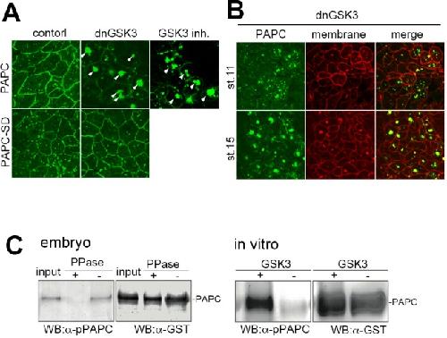 Figure 4. GSK3 is involved in the regulation of PAPC localization and stability.(A) Inhibiting GSK3 activity by expression of dominant-negative GSK3 (dnGSK3), or treating explants with a GSK3 inhibitor BIO one hour prior to observation, led to extensive aggregation of PAPC in the cytoplasm in animal cap cells (arrowheads). A putative phosphorylation-mimic mutant PAPC-SD, which carries S816 and S820 to aspartic acid mutations, was resistant to dnGSK3 expression and remained on the plasma membrane. (B) PAPC was not efficiently degraded in DMZ explants expressed with dominant-negative GSK3 (dnGSK3) at stage 15 and formed cytoplasmic aggregates. (C) GST-tagged PAPC was expressed in the dorsal marginal zone. When embryos reached the gastrula stage, PAPC-GST was partially purified with Glutathione Sepharose 4B. Phosphorylated PAPC (pPAPC) was detected by anti-phosopho-PAPC antibody, raised against phosphorylated DSR peptide as an antigen. The pPAPC signal was abolished by treating the extract with lambda protein phosphatase (PPase). The recombinant C-terminal domain of PAPC was phosphorylated in vitro in the presence of recombinant GSK3, as confirmed by a Western blot using anti-pPAPC antibody. Total input of PAPC was estimated by anti-GST antibody.