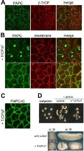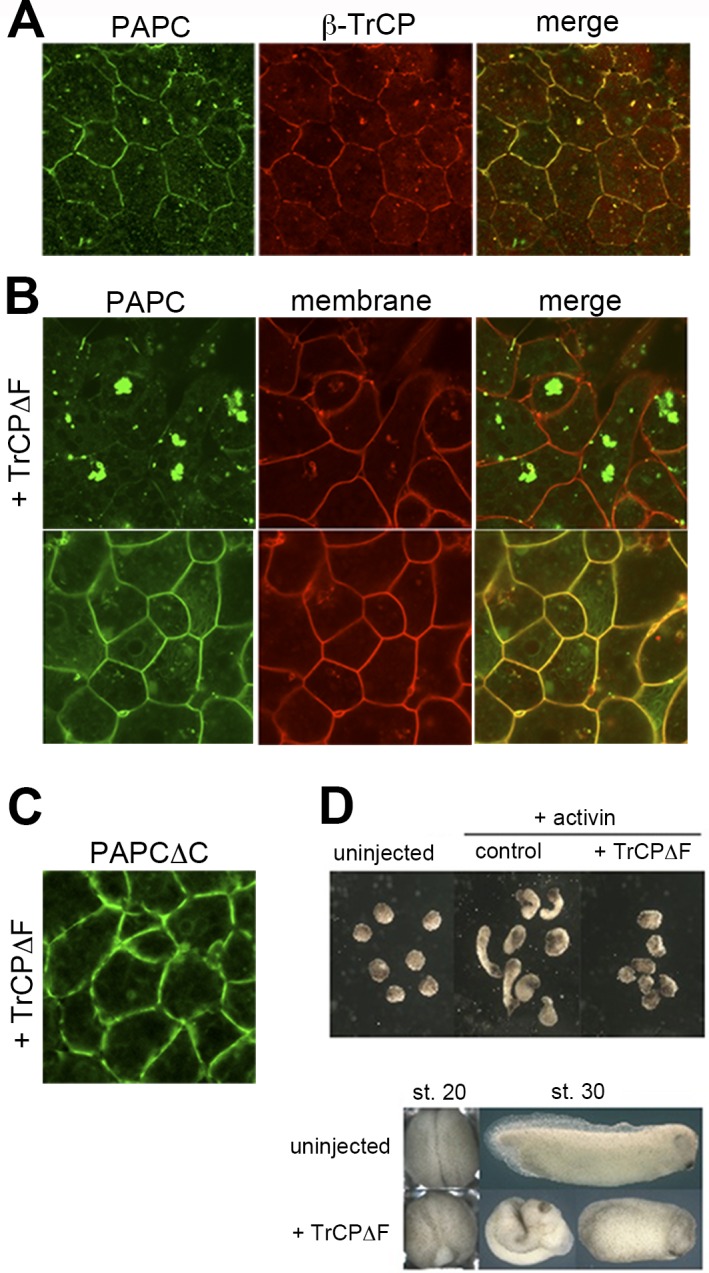 Figure 6. β-TrCP interacts with and ubiquitinates PAPC and is required for normal Xenopus embryogenesis.(A) β-TrCP tagged with RFP co-localized with PAPC-GFP in animal cap cells, both on the plasma membrane and cytoplasmic punta (arrowheads). (B) Expression of TrCPδF, a dominant-negative form of TrCP that lacks the F-box essential for E3 ligase complex formation, induced PAPC cytoplasmic aggregates in animal cap cells. Note the cells that appear rounder than those in (A). (C) GFP-tagged PAPCδC was co-expressed with TrCPδF in Xenopus DMZ cells. (D) TrCPδF expression inhibited animal cap elongation when treated with activin. TrCPδF also gave rise to gastrulation phenotypes such as defective blastopore closure and a shortened body axis.