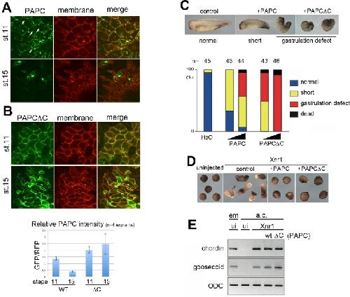 Figure 1. PAPC is down-regulated in the dorsal marginal zone explants at late gastrula.(A) GFP-tagged PAPC (PAPC-GFP) was expressed in the dorsal marginal zone (DMZ) of a Xenopus embryo. In the DMZ explant at stage 11 (early gastrula), PAPC-GFP was found mainly on the plasma membrane (marked by membrane-targeted RFP), with some cytoplasmic puncta (arrowheads). At stage 15 (early neurula), PAPC-GFP signal was greatly reduced and excluded from the plasma membrane. (B) GFP-tagged PAPC mutant lacking the cytoplasmic domain (PAPCÎC) was not degraded and persistently localized to the plasma membrane at stages 11 and 15. PAPC-GFP signal was reduced at stage 15 as measured by relative fluorescent intensity using membrane-RFP as an internal control, while PAPCÎC-GFP signal persisted. (C) Injecting an increasing amount of wild-type PAPC mRNA into Xenopus embryos induced more severe gastrulation defects, including a short body axis and spina bifida at stage 28. PAPCÎC over-expression exhibited stronger effects. The amount of injected RNAs was 200 and 1000 pg, respectively. (D) Over-expression of PAPC or PAPCÎC inhibited elongation of animal caps mesodermalized by Xnr1 expression. (E) Induction of mesoderm was confirmed by expression of chordin and goosecoid (gsc) by RT-PCR. em, embryos; a.c., animal caps; ui, uninjected.