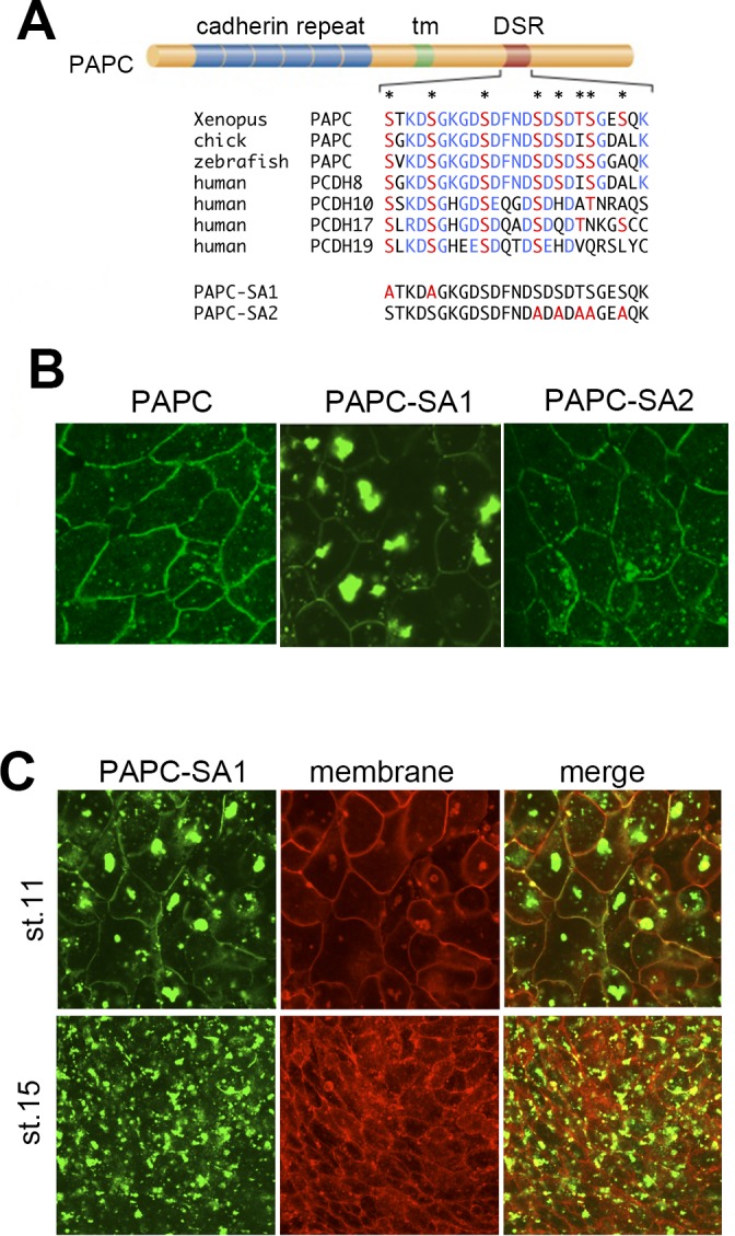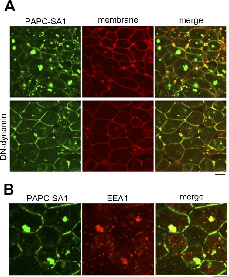 Figure 3. PAPC localization is regulated by endocytic recycling.(A) PAPC-SA1 and membrane-RFP were co-expressed in animal cap cells (upper panel). PAPC-SA1, membrane-RFP and dominant-negative (DN) dynamin were co-expressed (lower panel). (B) PAPC-SA1 was co-expressed with Early endosome antigen-1 (EEA1) tagged with RFP.
