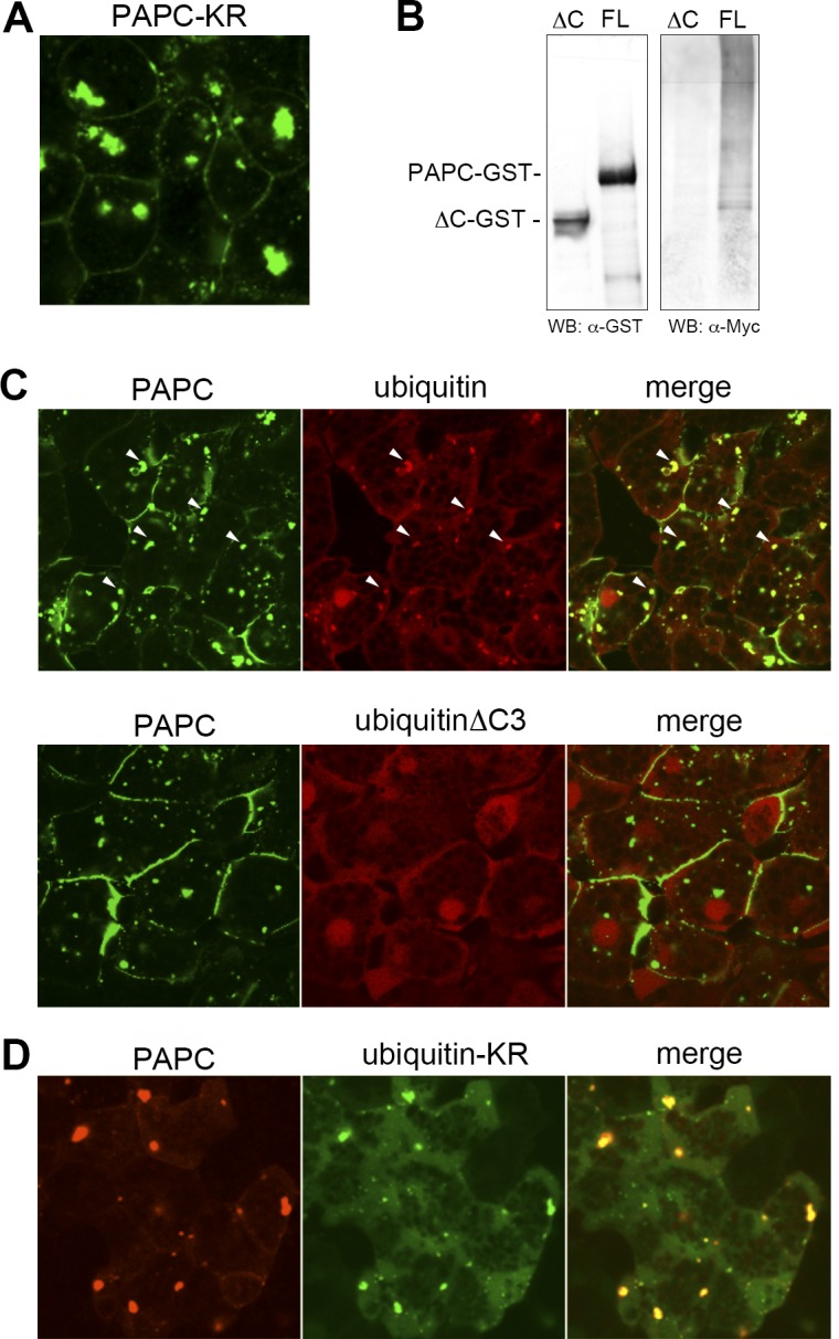 Figure 5. Poly-ubiquitination in the cytoplasmic vesicle regulates PAPC localization.(A) Changing nine lysine residues in the cytoplasmic region of PAPC to arginine resulted in PAPC aggregation in the cytoplasm, indicating the role of ubiquitination in PAPC localization. (B) The ubiquitination assay revealed that PAPC is poly-ubiquitinated in the Xenopus embryo. Myc-tagged ubiquitin co-expressed with GST-tagged full-length PAPC (FL) in the Xenopus embryo was purified with PAPC-GST and detected as a high molecular weight ladder. Deletion of PAPC cytoplasmic domain (ΔC) diminished poly-ubiquitination. (C) RFP-tagged ubiquitin and GFP-tagged PAPC co-localized in the cytoplasmic vesicle in animal cap cells (arrowheads). By contrast, RFP-tagged UbiquitinΔC3, which has three amino acids at the C-terminus removed and therefore cannot be conjugated to the target, did not co-localize with PAPC-GFP in animal cap cells. GFP-tagged ubiquitin-KR, which is conjugated to the target but blocks formation of poly-ubiquitin, co-localized with PAPC-RFP in the cytoplasmic vesicles. Ubiquitin-KR-GFP-expressing cells from which PAPC had been depleted from the plasma membrane exhibited a round morphology indicative of reduced cell-cell adhesion.