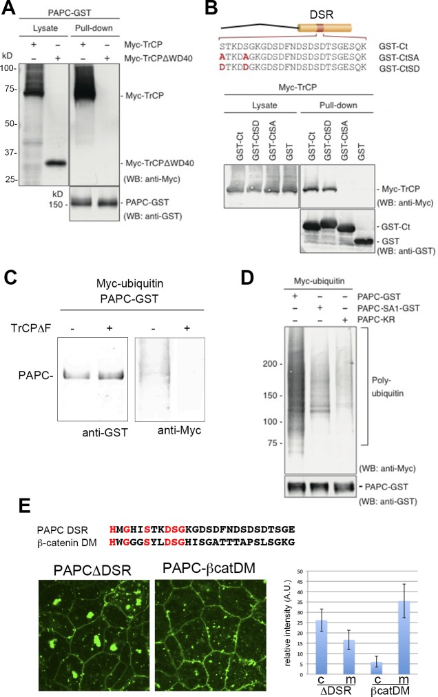 Figure 7. Phosphorylation-dependent β-TrCP interaction and ubiquitination of PAPC.(A) GST pull-down assay between PAPC-GST and β-TrCP. β-TrCP was pulled-down by PAPC, whereas PAPC without the substrate recognition domain (WD40 repeat; β-TrCPÎWD40) did not display an interaction with PAPC. Western blot bands of Myc-β-TrCP have smears in the upper regions. These are due to poly-ubiquitination of β-TrCP. (B) C-terminal domains of wild-type (Ct) and phosphorylation-mimic (CtSD) PAPC were able to pull-down β-TrCP. Non-phosphorylated form of PAPC C-terminal domain (CtSA) did not interact with β-TrCP. (C) The ubiquitination assay showed that PAPC is poly-ubiquitinated in Xenopus embryos but that this was abolished by expressing dominant-negative β-TrCP (β-TrCPÎF). (D) Non-phosphorylated form of PAPC (PAPC-SA13) and PAPC with lysine-to-arginine mutations in the cytoplasmic region (PAPC-KR) exhibited markedly reduced poly-ubiquitination. (E) The amino acid sequences of the PAPC DSR domain and the β-catenin destruction motif (DM) are weakly similar. The localizations of GFP-tagged PAPCÎDSR and GFP-tagged PAPC-β-catDM (PAPC whose DSR domain was replaced by β-catenin DM) were shown. The graph shows the relative signal intensity in the cytoplasm (c) and on the plasma membrane (m).