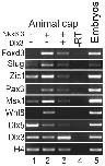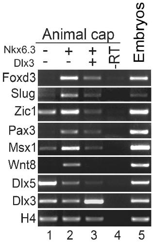 Figure 6. Dlx3 blocks the neural crest induction activity of Nkx6.3.RT-PCR analysis in animal cap assay showing the effect of Dlx3 on the expression of the indicated neural crest genes induced by Nkx6.3. Note that the expression of endogenous Dlx3 and Dlx5 were all reduced upon Nkx6.3 over-expression. -RT, negative control with reverse-transcriptase omitted in the RT reaction; embryo, RNA template from whole embryos was used as a positive control.