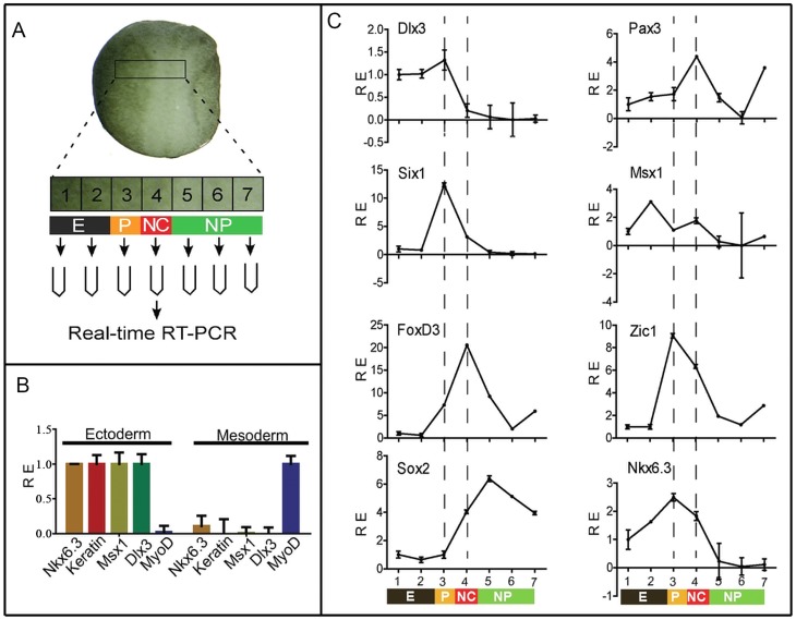 XNkx6.3 is expressed in the neural plate border ectoderm.(A) Experimental strategy to verify the expression domain of Nkx6.3 by qPCR. A transverse slice of tissue of the potential neural plate border region of single stage 17 embryos was dissected out and separated sequentially into 7 pieces, which were expected to represent epidermis, placode, neural crest and neural plate identities respectively. The explants were then processed to real-time RT-PCR analysis. E, epidermis; P, placode; NC, neural crest; NP, neural plate. (B) Nkx6.3 is expressed predominantly in the ectoderm. A piece of tissue corresponding to region 3 in (A) was dissected out and separated into surface ectodermal and deep mesodermal parts. The expression of Nkx6.3 and known ectodermal (Keratin, Dlx3 and Msx1) and mesodermal (MyoD) genes were monitored by qPCR. (C) The expression of Nkx6.3 and known neural plate border markers in a representative series of dissected epidermis, placode, neural crest, and neural plate explants from a single embryo at stage 17. The series of explants from each embryo were checked first for the expression of Dlx3, Six1, FoxD3 and Sox2, and only those with relative clean separation of the epidermis, placode, neural crest and neural plate were further analyzed for the expression of Nkx6.3 and additional markers. RE, relative expression.