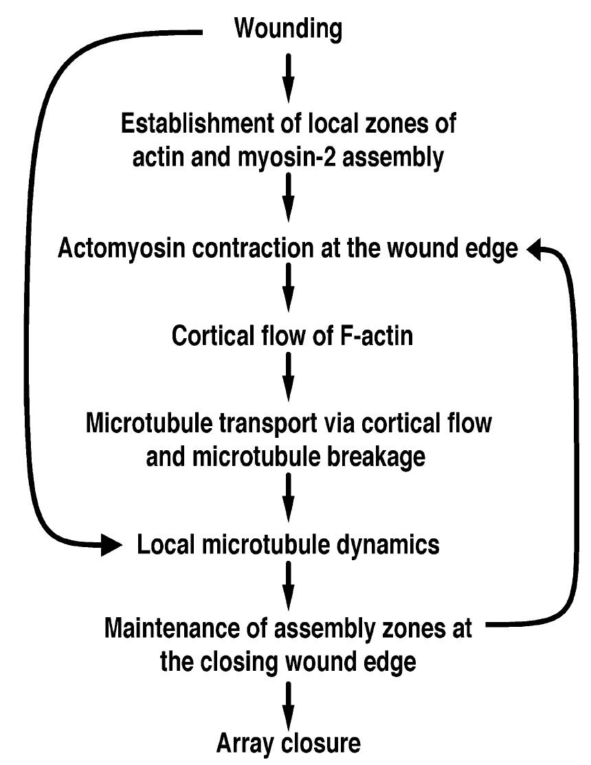 CONCLUSIONS: The results reveal transport of microtubules in association with F-actin that is pulled to wound borders via actomyosin-based contraction. Microtubules, in turn, focus zones of actin assembly and myosin-2 recruitment at the wound border. Thus, wounding triggers the formation of a spatially coordinated feedback loop in which transport and assembly of microtubules maintains actin and myosin-2 in close proximity to the closing contractile array. These results are surprisingly reminiscent of recent findings in locomoting cells, suggesting that similar feedback interactions may be generally employed in a variety of fundamental cell motility processes.