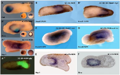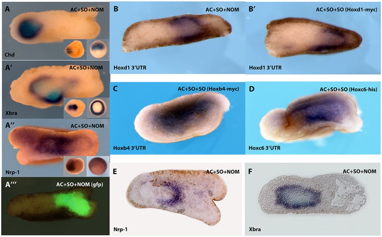 B: A wrap containing SO and NOM and ectoderm [AC(SO/NOM)AC] shows induction of Hoxd1 in the neurectoderm as well as mesoderm. B’, A wrap containing normal SO and SO ectopically expressing Hoxd1 also shows the induction of endogenous Hoxd1 in the neurectoderm as well as in the mesoderm. Endogenous Hoxd1 expression was detected using a 3′UTR probe that recognizes only the endogenous messenger. C, ectopic Hoxb4 in SO induces its own expression within the neurectoderm and in the mesoderm as in B’. D, wrap as in B’ and C but with ectopic Hoxc6 expression. This shows induction of Hoxc6 in neurectoderm and in the mesoderm. We used 3′UTR probes to detect expression of the endogenous mRNA’s in each of these experiments. E, F sections showing expression of Nrp1 (neural) and Bra (mesodermal) in control or standard [AC(SO/NOM)AC] recombinant. E