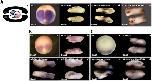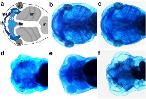 Figure 5. Craniofacial structures of Xenopus laevis tadpoles upon injection of Hoxd1 mRNA or protein.a: Schematic ventral view of an uninjected untreated control embryo. b: uninjected embryo. c: embryo injected with wild type GFP into the blastoecel at blastula stage. d: Embryo injected with Hoxd1 mRNA at 4 cell stage. e: Embryo injected with recombinant HOXD1 protein into 4 cell stage embryo. f: injection of recombinant HOXD1 protein into the blastoecel. Please note that standard injection of Hoxd1 mRNA or its protein counterpart injection in the cytoplasm or in the extracellular matrix leads to similar phenotypes in d, e and f. The embryos are strongly posteriorised as shown by the reduction (or deletion) of anterior structures. These data strongly suggest that the Hoxd1 protein successfully crossed the cellular membranes and retained its function as it leads to a severe truncation of anterior cartilage structures. Infrarostrale (in), Meckel’s cartilage (me), palatoquadrate (pa), ceratohyale (ce), basibranchiale (ba), branchial arches (br), eye (ey), intestine (in). Each photo represents 10 identically treated embryos giving the same result.