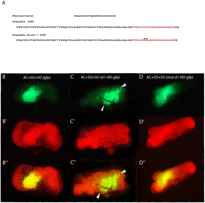 Figure 3. Hoxd1 homeoprotein containing a penetratin sequence is transferred from mesoderm to neurectoderm and its homeodomain plays a cargo function for gfp.A: Penetratin sequence is shown. Above, Hoxd1 homeodomain (HD) contains a penetratin like sequence (in red). This conserved sequence is a feature of all homeodoproteins. Below, two amino-acids WF within the penetratin were mutated into SR (highlighted by stars) to create a mutated Hoxd1 HD, mut HD. This mutation abrogates the transfer function of the HD. B–D”: Localisation of different fluorescent chimeric GFP proteins in recombinants after 6–8 hrs of culture. These proteins were introduced into wrap recombinates in SO. B: wild type GFP. C: wild type GFP coupled to wild type Hoxd1 homeodomain (d1-HD-gfp). D: the mutated homeodomain version coupled to wild type GFP (mut d1-HD-gfp).The signal has spread in d1-HD-gfp but not in wild type GFP or mut d1-HD-gfp. The GFP fluorescence is combined with phalloidin staining to increase its visibility. B, B’, B”: GFP expressed in the SO stays confined within the SO explant and fails to spread into surrounding neurectoderm. C, C’, C”: