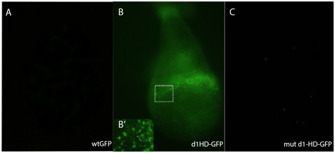 Figure 4. Uptake of d1-HD-GFP and GFP by Drosophila imaginal wing discs.Drosphila imaginal wing discs were incubated with Hoxd1-HD-GFP (d1-HD-gfp) recombinant protein (B) or wild type GFP protein (A). or mutated mut-d1-HD-GFP. Recombinant d1-HD-gfp was taken up by the discs while wild type GFP and mut-d1-HD-GFP were not. Each photo in this figure represents 10 imaginal discs giving the same result. These data clearly show the cargo function of Hoxd1 homeodomain and suggest that this uptake is by a species independent mechanism.
