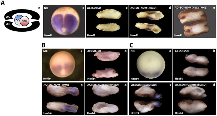 Aa, Wrap assay consists of a piece of non-organiser mesoderm (NOM) and a piece of Spemann organiser mesoderm (SO) combined between two ectodermal animal caps. All tissues are excised from early gastrulae (st. 10a) Ab, Ba, Ca: External views of late gastrula stage Xenopus laevis expressing Hoxd1, Hoxb4 and Hoxb9 respectively. Note that the midline of the embryo, overlying the SO, does not express any Hox gene. Ac, Bb, Cb: wraps containing only SO explants [AC(SO/SO)AC]. Ad, Bc, Cc: wraps containing SO and NOM treated with control morpholino (ctMO) [AC(SO/NOM+ctMO)AC]. Ae, Bd, Cd, wrap with NOM treated with Hoxd1-, Hoxb4 and Hoxb9 MOâs respectively. Please note that in each case, only the wraps containing NOM and SO show Hox expression in the neurectoderm (Ad, Bc, Cc) and those containing only SO do not show any expression in accordance with the embryoâs lack of Hox expression in SO (Ab, Ba, Ca, and Ac, Bb, Cb). In each case, Hox MO treatment of NOM mesoderm also prevents the expression of the homologous Hox gene in neurectoderm (Ae, Bd, Cd). These wraps were fixed and analysed 6â8 hrs after they were made. Each photo of two recombinates or an embryo in this figure is representative of at least 20 recombinates or embryos, all showing the same result.