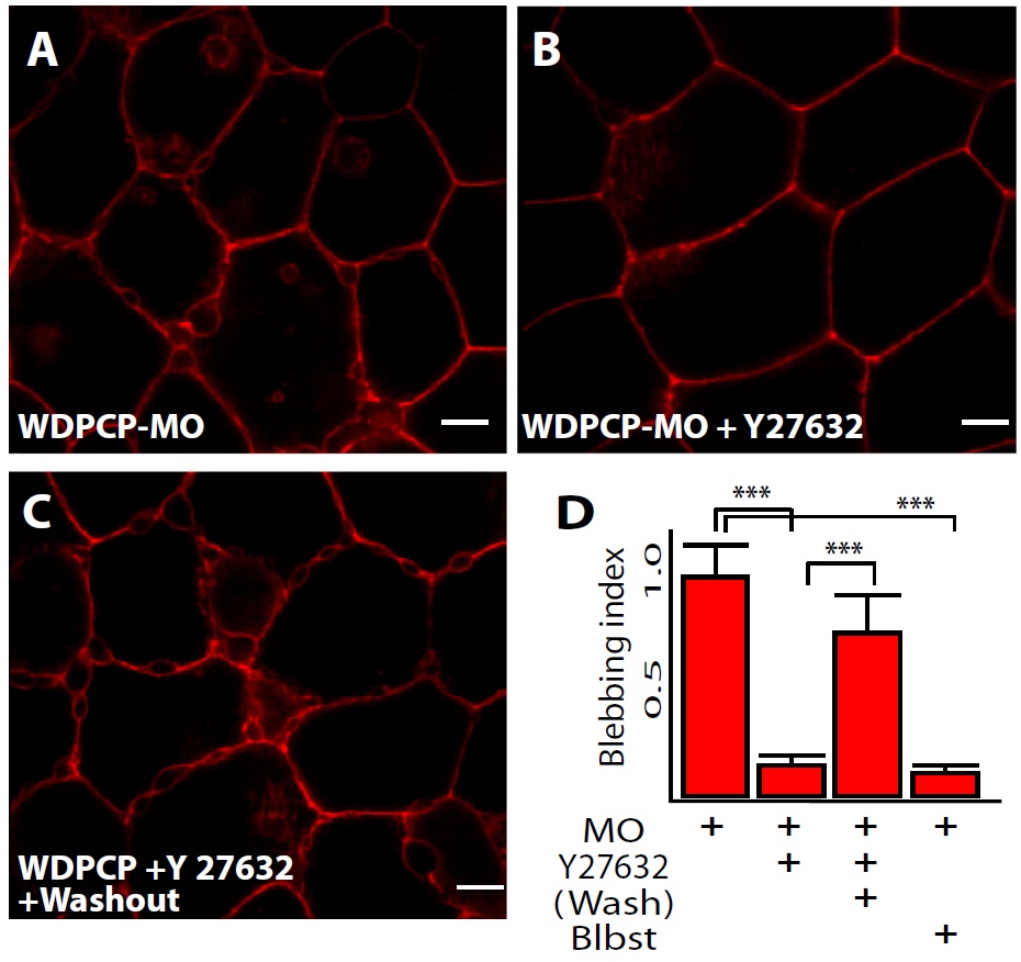 1 hour washout of Y27632. (D) Quantification of blebbing index; Wdpcp-MO n = 24;