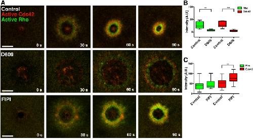 FIGURE 4:. Blocking generation of DAG, but not PA, inhibits Rho and Cdc42 activation. (A) Cells were injected with eGFP-rGBD and mRFP-wGBD to detect active Rho and active Cdc42, respectively. In cells treated with D609, Rho and Cdc42 activity is inhibited and wound healing stalls, whereas FIPI treatment does not inhibit GTPase activity or healing. (B) Intensity of Rho and Cdc42 zones from control and D609-treated cells was quantified at 60 s (Rho: control vs. D609, p < 0.01; Cdc42: control vs. D609, p < 0.005). (C) Intensity of Rho and Cdc42 zones from control and FIPI-treated cells was quantified at 60 s (Rho: control vs. FIPI, p >0.05; Cdc42: control vs. FIPI, p < 0.01). Top and bottom whiskers represent maximum and minimum values, respectively. Scale bar, 20 μm.
