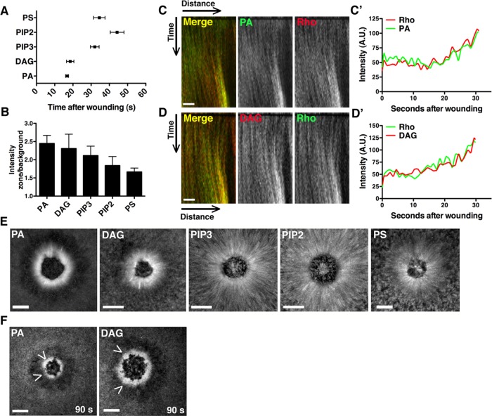 FIGURE 2:. PA and DAG are generated at the wound edge coincident with Rho GTPase activation. (A) Recruitment times for each lipid were quantified. PA appeared at 16.8 s, and DAG at 18.5 s, whereas PIP3, PIP2, and PS accumulated at ≥32 s (PA, n = 10; DAG, n = 12; PIP3, n = 12; PIP2, n = 8; PS, n = 8; error bars, SEM). (B) The ratio of zone/background fluorescence intensity was calculated for each lipid at 90 s (PA, PIP3, n = 6; DAG, PIP2, PS, n = 5; error bars, SEM). (C) Cells injected with mCherry-rGBD and eGFP-Spo20 were wounded. A kymograph shows corecruitment of active Rho and PA to the wound edge. (C′) The intensity/time plotted from a vertical line drawn through the wound edge in C. (D) Cells injected with eGFP-rGBD and mRFP-C1 were wounded. A kymograph shows corecruitment of active Rho and DAG to the wound edge. (D′) Intensity/time plotted from a vertical line drawn through the wound edge in D. (E) Brightest-point projections from movies show the contribution of cortical flow (indicated by lines perpendicular to the wound edge) to enrichment of each lipid. PA and DAG are less dependent on cortical flow than PIP3, PIP2, and PS. (F) Cells were treated with latrunculin A to abolish actin-mediated cortical flow, but PA and DAG still accumulated, as indicated by arrowheads. Scale bar, 10 μm (C, D); 20 μm (E, F).