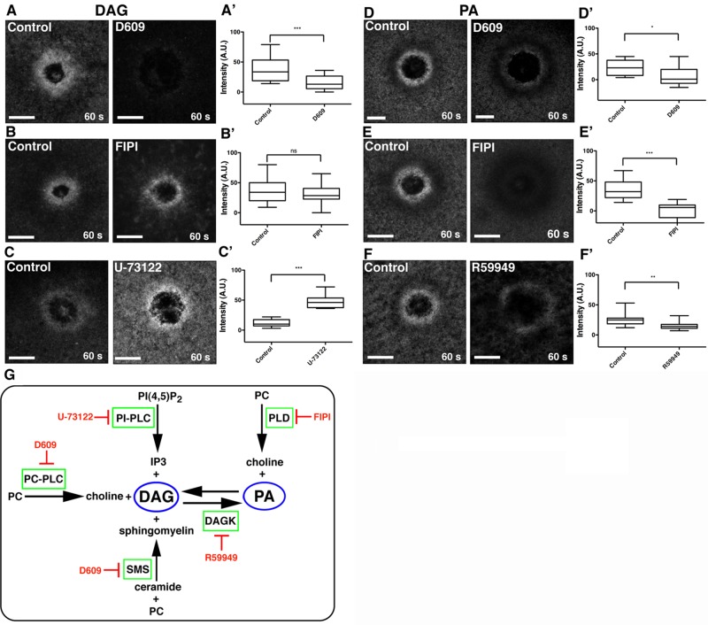 FIGURE 3:. DAG is generated via the PC-PLC/SMS pathway, whereas PA is generated via PLD and DAG kinase. (A) DAG is present at wounds in control cells but blocked by the PC-PLC/SMS inhibitor D609. (A′) Quantification of wound DAG (***p < 0.005). (B) DAG is present at similar levels at wounds in control cells and those treated with FIPI, a PLD inhibitor. (B′) Quantification of wound DAG (p > 0.05). (C) DAG at wounds is elevated in cells treated with the PIP2-PLC inhibitor U-73122. (C′) Quantification of wound DAG (***p < 0.005). (D) PA is decreased in cells treated with D609 relative to controls. (D′) Quantification of wound PA (*p < 0.05). (E) PA wound signal is blocked in cells treated with FIPI. (E′) Quantification of wound PA (***p < 0.005). (F) PA levels at wounds are decreased in cells treated with R59949, a DAG kinase inhibitor. (F′) Quantification of wound PA (**p < 0.01). (G) Schematic of pathways leading to DAG and PA generation and corresponding inhibitors. Top and bottom whiskers represent maximum and minimum values, respectively. Scale bar, 20 μm.