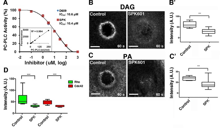 FIGURE 5:. SPK601 inhibits PC-PLC, DAG production, and Rho and Cdc42 activation. (A) SPK601 (SPK) is as an effective inhibitor of PC-PLC in vitro as D609. Lipase activity of purified PC-PLC was assayed at the indicated concentrations of each inhibitor. (B) SPK601 suppresses DAG production around wounds. (B′) Quantification of wound DAG (p < 0.005). (C) SPK601 suppresses PA production around wounds. (C′) Quantification of wound PA (p < 0.005). (D) SPK601 suppresses Rho and Cdc42 activation around wounds. Intensity of Rho and Cdc42 zones from control and SPK601-treated cells was quantified at 60 s (Rho: control vs. SPK601, p < 0.005; Cdc42: control vs. SPK601, p < 0.005). Top and bottom whiskers represent maximum and minimum values, respectively. Scale bar, 20 μm.
