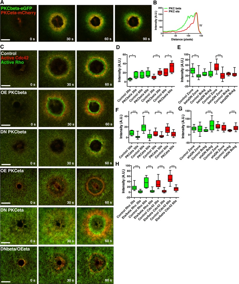 FIGURE 7:. PKCβ and PKCη differentially regulate Rho and Cdc42 zones. (A) Cells injected with PKCβ -eGFP and PKCη-mCherry reveal localization of both PKCs to the wound edge, with PKCβ spanning a broader region than PKCη. (B) A line scan from the 90-s time point of A. (C) Cells were injected with eGFP-rGBD and mRFP-wGBD alone or with PKCβ, DN PKCβ, PKCη, DN PKCη, or DN PKCβ and PKCη. PKCβ up-regulates Rho and Cdc42 activity zones, whereas DN PKCβ down-regulates zones. PKCη inhibits Rho and Cdc42 activity zones, whereas DN PKCβ up-regulates Rho and Cdc42 activity on the cortex. Expression of DN PKCβ and full-length PKCη results in dramatic inhibition of both Rho and Cdc42 activity zones. (D) Quantification of Rho and Cdc42 zone intensity at 30 and 60 s with PKCβ expression (control, n = 6; PKCβ, n = 7). (E) Quantification of Rho and Cdc42 zone intensity at 60 s and background intensity with DN PKCβ expression (control, n = 16; PKCβ DN, n = 11). (F) Quantification of Rho and Cdc42 zone intensity at 30 and 60 s with PKCη expression (n = 14). (G) Quantification of Rho and Cdc42 zone intensity at 60 s and background intensity with DN PKCη expression (control, n = 16; PKCη DN, n = 11). (H) Quantification of Rho and Cdc42 zone intensity at 30 and 60 s with expression of DN PKCβ and full-length PKCη (control, n = 16, PKCβ DN/PKCη, n = 13). Green bars, Rho; red bars, Cdc42. Top and bottom whiskers represent maximum and minimum values, respectively. Scale bar, 20 μm. W, wound.