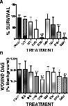 FIGURE 6:. Dose-dependent suppression of healing and DAG production by SPK601 or D609. (A) Cells were treated with DMSO, the vehicle, or the indicated micromolar concentrations of SPK601 (S) or D609 (D) for 1 h, stab wounded with a glass needle, cultured overnight, and then assessed for survival. SPK601 and D609 both significantly suppressed healing at concentrations of 100 or 200 μM. (B) Quantification of wound DAG levels in cells treated as in A. Bars, mean ± SD; *p < 0.05; ***p < 0.005.