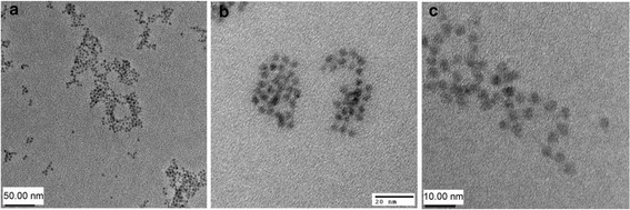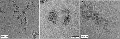 Figure 1. Transmission electron microphotographs of the synthesized CdSe-ZnS QD. (a) Scale bar is 50 nm. (b) Scale bar is 20 nm. (c) Scale bar is 10 nm.