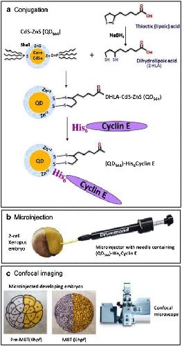 Figure 2. Schematic showing experimental design. (a) DHLA capping of CdSe-ZnS (QD564) and subsequent conjugation of (His6)-Cyclin E (modified from [5]). (b) Microinjection of (QD564)-His6Cyclin E into 2-cell Xenopus embryos and (c) confocal imaging of microinjected pre-MBT and MBT Xenopus embryos. In (a) the DHLA molecule contains a bidentate thiol moiety on one end, allowing its stable attachment to the inorganic QD surface. Coupling of (His6)-Cyclin E to QD is achieved via strong metal affinity between the histidine tag of the protein and Zn+2 atoms on the QD surface. The schematic is not to scale.