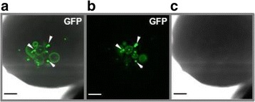 Figure 5. Cyclin E accumulates in the nucleus of live Xenopus laevis embryos at the MBT (6 hpf). One cell of the 2-cell embryo was microinjected with in vitro transcribed Myc6-GFP-Cyclin E RNA and the translated protein visualized in live embryos using confocal microscopy in real time. (a, b) Fluorescence channel, Z stack images #5 and #8 from the top, respectively. Nuclei are marked with white arrowheads. (c) Light field image. A 3D image is shown. Scale bars are 100 μM. Embryos were viewed with a 10X objective on a Zeiss LSM 510 confocal microscope equipped with a META detector, and analyzed using LSM510 Image Acquisition software. At least 20 embryos were injected in at least 3 separate experiments.