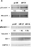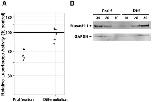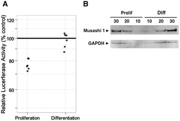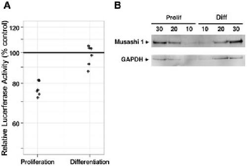 De-repression of a Musashi-dependent reporter mRNA during differentiation of SH-SY5Y cells. (A) SH-SY5Y cells were transfected with plasmids encoding luciferase reporter mRNAs under control of a Musashi binding element (MBE) or a control 3′ UTR (Control) and luciferase activity was assessed, relative to a co-transfected Renilla luciferase standard, following culture under proliferation or differentiation conditions for 24 hours. The dot plot shows the relative luciferase activity of six independent experiments as a percent of the 3′ UTR control (100%) for both proliferation and differentiation, as indicated. Luciferase expression was repressed in proliferating cells (mean of 77% with a 95% confidence interval: 73 to 81%; p < 0.0001, one sample t-test) but not in differentiated cells (mean of 97.7% with a 85% confidence interval 90.6 to 105.4%, p > 0.47, one sample t-test). (B) Western blot demonstrating persistence of Musashi1 in SH-SY5Y cells 24 hours after induction of differentiation. In this experiment, 10, 20 and 30 μg total protein (as indicted) were analyzed for Musashi1 and GAPDH protein levels from proliferating neurosphere culture (Prolif) or cells cultured in neuronal differentiation media for 24 hours (Diff). A representative experiment is shown.