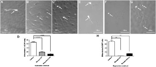 Overexpression of Musashi1 blocks neural differentiation. NSPCs (panels A-D) and SH-SY5Y cells (panels E-H) were transfected with a plasmid encoding the eGFP moity alone (A and E), wild-type Musashi1 (B and F) or Musashi1 encoding a non-phosphorylatable S337A mutation (C and F) fused to a C-terminal eGFP epitope tag and incubated at low cell density under differentiation conditions for 4 days (NSPCs) or 7 days (SH-SY5Y) and scored for initiation of differentiation phenotype (hypertrophic cells with neurites > 2 soma lengths). Representative photos shown. Some variations in the intensity and subcellular distribution of Musashi1 or Musashi1 S337A were noted in transfected cells within the same experiment. Over the course of three experiments, a total of 70 NSPC cells (A) or 136 SHSY5Y cells (E) transfected with eGFP alone were counted. (D and H) represent histograms showing quantitation of the differentiation data (mean of three experiments with SEM) at 14 days (D) or 7 days (H). ****,p < 0.0001 for (D); **,p < 0.01 for (H)) as assessed by one-way ANOVA.