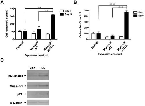Inhibition of Musashi phosphorylation promotes cell survival. (A) NSPCs and (B) SH-SY5Y cells were transfected with the eGFP tagged Musashi proteins described in Figure 3 and fluorescent cells were photographed and counted 1 day after transfection then maintained under conditions of serum deprivation for 14 days (NSPC) or 4 days (SH-SY5Y) and counted relative to cell expressing the control, eGFP tag alone. Histogram represents the mean of the three experiments with SEM. The difference in surviving cell numbers were significant (**,p < 0.01 for NSPCs; ****,p < 0.0001 for SH-SY5Y cells). (C) SH-SY5Y cells were maintained as neurospheres in control proliferation media (Con) or plated on adherent substrate under conditions of serum starvation for 3 days (SS). Protein lysates were processed for western blotting with the indicated antibodies.