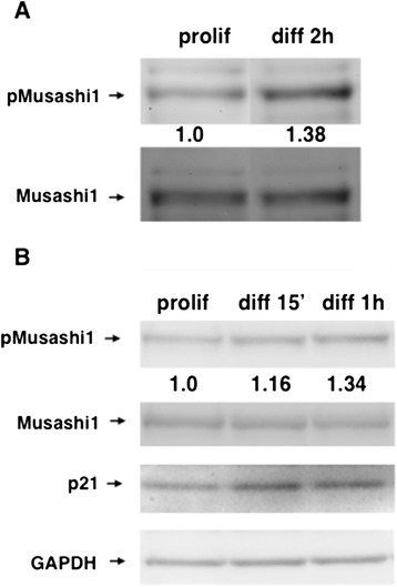 BACKGROUND: There is increasing evidence of a pivotal role for regulated mRNA translation in control of developmental cell fate transitions. Physiological and pathological stem and progenitor cell self-renewal is maintained by the mRNA-binding protein, Musashi1 through repression of translation of key mRNAs encoding cell cycle inhibitory proteins. The mechanism by which Musashi1 function is modified to allow translation of these target mRNAs under conditions that require inhibition of cell cycle progression, is unknown.