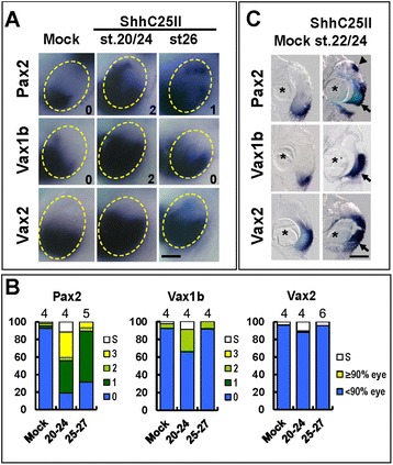Grafts of ShhC25II-soaked beads reproduce the stage-dependent effects of PMP treatments on eye DV patterning. (A) Lateral views of heads of st. 33 embryos that received a graft of control or ShhC25II-soaked beads next to the optic vesicle at the indicated stages and hybridized with probes for Pax2, Vax1b or Vax2. Compared to controls, embryos grafted with ShhC25II beads show stage-dependent increase in the expression domains of ventraleye genes. Scale bar, 100 μm. (B) Quantification of the percentages of embryos with different effects on gene expression domains or eye reductions (S) in each treatment condition. The number of experiments performed for each probe and treatment condition is indicated on top of the corresponding histogram bar. (C) Histological sections of eyes of st. 33 embryos treated as in (A) and (B) and hybridized with the indicated probes, confirming stage dependent effects on DV eye patterning as detected in whole mount views. Triangles point to ectopic Pax2 expression in the dorsal marginal zone and arrows to expanded ventral expression domains of Pax2, Vax1b and Vax2, in embryos grafted ShhC25II beads. Stars indicate the position of the beads. Scale bar, 100 μm.