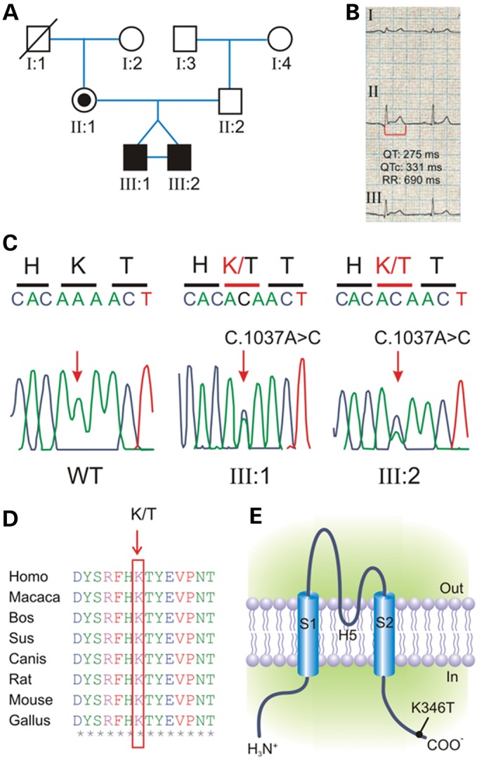 Figure 1. Mutation detection by sequence analysis of the KCNJ2 coding region. (A) Pedigree of the family harboring a novel mutations in KCNJ2. Squares are males and circles females; solid black symbols represent propositi and slash deceased individual. (B) ECG recording from propositi showing shortened QT interval (heart rate, 87 bpm; QT 275 ms; paper speed 25 mm/s). (C) Electropherograms showing the heterozygous c.1037A>C transition (arrow-headed), predicting a novel non-synonymous p.K346T variant in propositi compared with the sequence of a healthy individual (WT). (D) Alignments of several KCNJ2 sequences flanking the K346T substitution (K/T, arrow-headed) showing that this residue is highly conserved in several vertebrate species. (E) Schematic representation of the membrane topology of a human Kir2.1 subunit indicating the position of the p.K346T variant.
