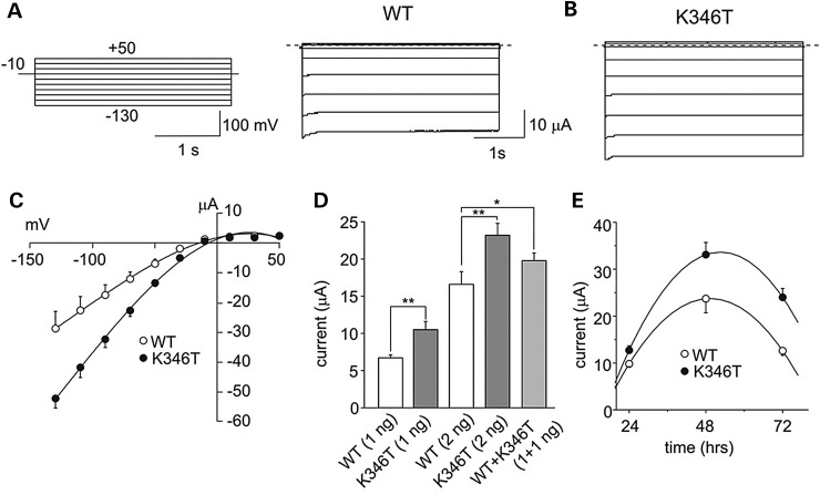 Figure 2. The K346T mutation increases Kir2.1 currents. Sample current families recorded from oocytes expressing WT (A) or K346T (B) mRNA (the pulse protocol is shown as inset). (C) I–V relationships for WT (white circles, 3 ng) and K346T (black circles, 3 ng) channels. (D) Current amplitudes recorded at −100 mV from cells injected with the indicated mRNAs whose amounts are reported in brackets (mean ± SEM; n = 120; *P < 0.05; **P < 0.01). (E) Current amplitudes recorded at −60 mV for WT (white circles) and K346T (black circles) channels and plotted as a function of time after mRNA injection (mean ± SEM; n = 6).