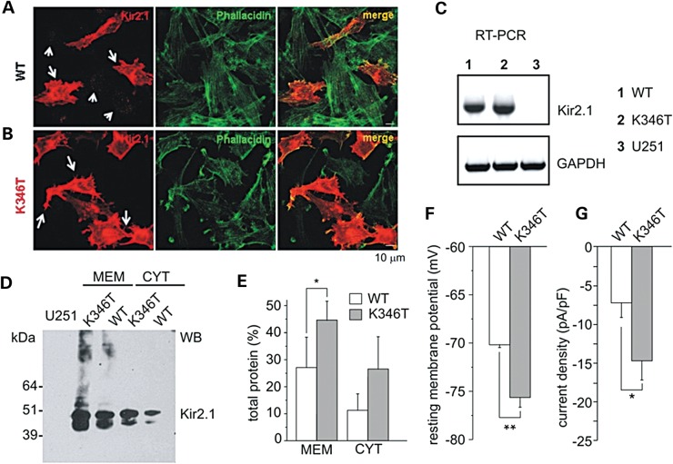 Figure 3. Characterization of astrocytoma cells expressing WT and K346T channels. Co-immunofluorescences of cells expressing WT (A) or K346T (B) channels with anti-Kir2.1 pAb (red) and FITC-conjugated phallacidin (green) show that WT channels are localized in perinuclear vesicles (short arrows in A) and occasionally at plasma membranes (long arrows in A), while mutated channels are mainly expressed at plasma membranes (long arrows in B). Scale bar: 10 μm. (C) RT-PCR analysis of Kir2.1 mRNA in WT (1), K346T (2) channel or empty-vector expressing U251 cell lines (3). GAPDH housekeeping gene normalizes the amount of template. (D) WB analysis of membrane (MEM) and cytosolic (CYT) proteins derived from WT or K346T Kir2.1-expressing cells after Histidine co-purification. Molecular weight markers are on the left (kDa). (E) Densitometric analysis of protein bands from four independent experiments (mean ± SEM, *P < 0.05). (F) The resting membrane potential and (G) current density (at −100 mV) were evaluated in cells expressing WT (white bars) or K346T (gray bars) channels (data are mean ± SEM; n = 6; *P < 0.05; **P < 0.01).
