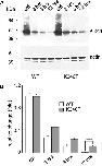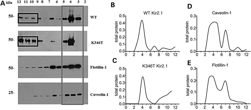 Figure 5. The K346T mutation affects the distribution of Kir2.1 channels in membrane lipid rafts. (A) WB analysis of cholesterol-rich (triton insoluble fractions: 3â5) and cholesterol-poor membrane fractions (triton soluble fractions: 10â12) of WT or K346T Kir2.1-expressing cells. WT channels are mainly distributed in triton insoluble fractions (gray box), whereas K346T is also abundantly localized in cholesterol-poor fractions (black boxes). Cav-1 and flotillin-1 identify the caveolar raft fractions. Molecular weight markers are on the left (kDa). (BâE) Normal distributions of total protein (indicated on top) in membrane fractions isolated by sucrose density gradient. The levels of protein in each fraction are normalized to the total protein amount recovered from all the fractions together.