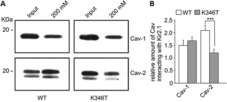 Figure 6. The K346T mutation reduces Kir2.1 channels interaction with Cav-2. (A) WB analysis of Kir2.1 channel's interactors after Histidine (His) co-purification of astrocytoma cells expressing WT or K346T channels. Input lanes represent protein extracts before His co-purification. WT and K346T channels co-purify similarly with Cav-1, whereas the K346T mutation reduces the association with Cav-2. One representative experiment out of three is shown. Molecular weight markers are indicated on the left (kDa). (B) Densitometric analysis (ratio) of protein bands corresponding to Cav-1 and Cav-2 normalized respect to WT (white bars) or K346T (gray bars) Kir2.1 protein levels. Data are expressed as mean ± SEM from three independent experiments (***P < 0.001).
