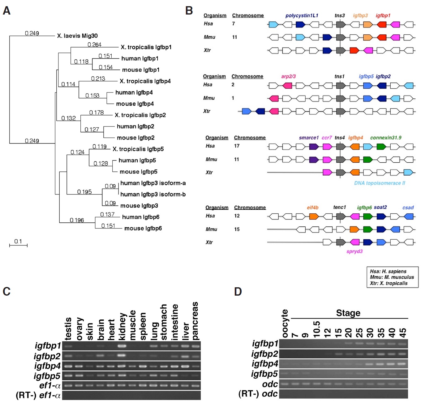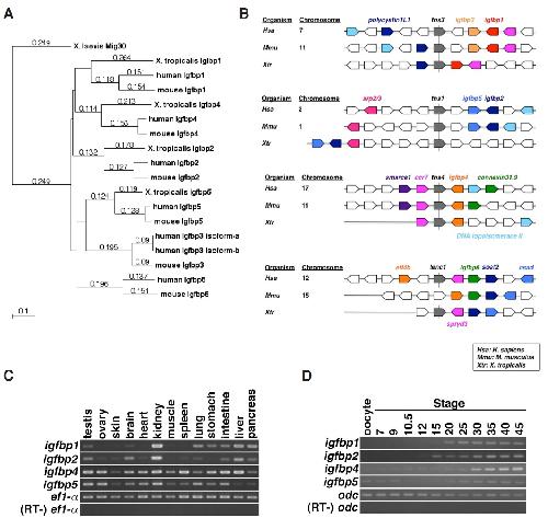 Fig. 1. Isolation of X. tropicalis igfbp genes and their expression patterns in embryonic and adult tissues. (A) Phylogenetic tree of Igfbp amino acid sequences. The phylogenetic tree was calculated by MacVector 11.1.0 software. X. laevis Mig30 (GenBank accession No. NP_001082206) (Hayata et al., 2002 and Kuerner et al., 2006) was used as an outgroup. Sequence sources (i.e., GenBank Accession Nos.) are as follows: X. tropicalis Igfbp1 (NP_001029118), Igfbp2 (NP_001093707), Igfbp4 (XP_002942630), Igfbp5 (NP_001016042); Mus musculus Igfbp1 (NP_032367), Igfbp2 (NP_032368), Igfbp3 (NP_032369), Igfbp4 (NP_034647), Igfbp5 (NP_034648), Igfbp6 (NP_032370); Homo sapiens Igfbp1 (NP_000587), Igfbp2 (NP_000588), Igfbp3 isoform-a (NP_001013416), Igfbp3 isoform-b (NP_000589), Igfbp4 (NP_001543), Igfbp5 (NP_000590), and Igfbp6 (NP_002169). (B) Synteny analysis of igfbp genes. Synteny of igfbp genes is conserved among human, mouse, and X. tropicalis. Tensin genes near igfbp loci are shown in grey, and orthologs are connected with a vertical line. Orthologs are shown in the same colors, and genes whose positions are not conserved among human, mouse, and X. tropicalis are shown in white. In X. tropicalis, igfbp3 and igfbp6 seem to be lost. (C) The expression of igfbp1, 2, 4, and 5 in adult tissues of X. tropicalis. (D) Temporal expression of igfbp1, 2, 4, and 5 during early development of X. tropicalis. Numbers indicate developmental stages.