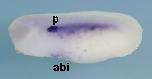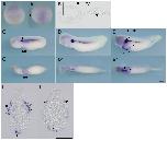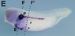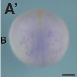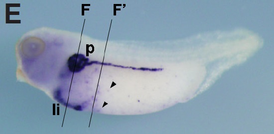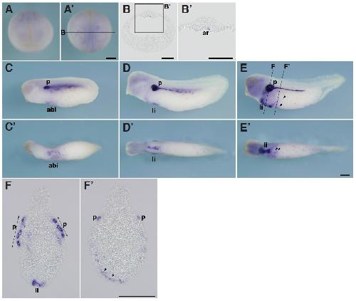 Fig.2. In situ hybridization analysis of igfbp1 during X. tropicalis development. (A,Aâ) Stage 20, (A) Anterior view (Aâ) dorsal view. (B,Bâ) Transversal section of an embryo at stage 20. (Bâ) Magnified view of the boxed area in (B). Dorsal side is displayed towards the top. Igfbp1 is expressed in part of the archenteron roof near the dorsal midline. (C,Câ) Stage 25, (D,Dâ) stage 30, (E,Eâ) stage 35, (C,D,E) lateral view, (Câ,Dâ,Eâ) ventral view. (F,Fâ) Transversal section of an embryo at stage 35. Positions of sections are indicated by black lines, and letters mark corresponding panels. ar, archenteron roof; abi, anterior blood islands; li, liver; p, pronephric tubule. Arrowheads indicate scattered blood-like cells. Scale bars indicate 200 mm.
