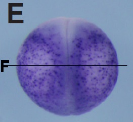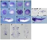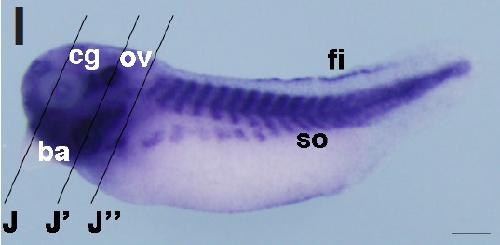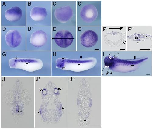 Fig. 5. In situ hybridization analysis of igfbp5 during X. tropicalis development. (A) Stage 9, (B) stage 10.5, (A,B) lateral view, (C,Câ) stage 12, (C) lateral view, (Câ) vegetal view, (D,Dâ) stage 15, (E,Eâ) stage 20, (D,E) dorsal view, (Dâ,Eâ) lateral view, (F,Fâ) transversal section of an embryo at stage 20. (Fâ) Magnified view of the boxed area in (F). (G) Stage 25, (H) stage 30, (I) stage 35, (J,Jâ,Jââ) transversal section of an embryo at stage 35. Positions of sections are indicated by black lines, and letters mark corresponding panels. nc, notochord; ar, archenteron roof; sm, somatic mesoderm; ov, otic vesicle; so, somite; ba, branchial arch; fi, fin; cg, cranial ganglia; om, oral membrane; ov, otic vesicle; he, heart. Scale bars indicate 200 mm.