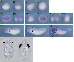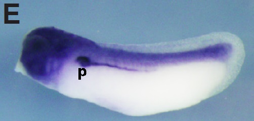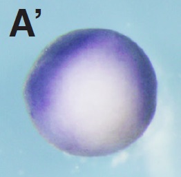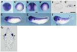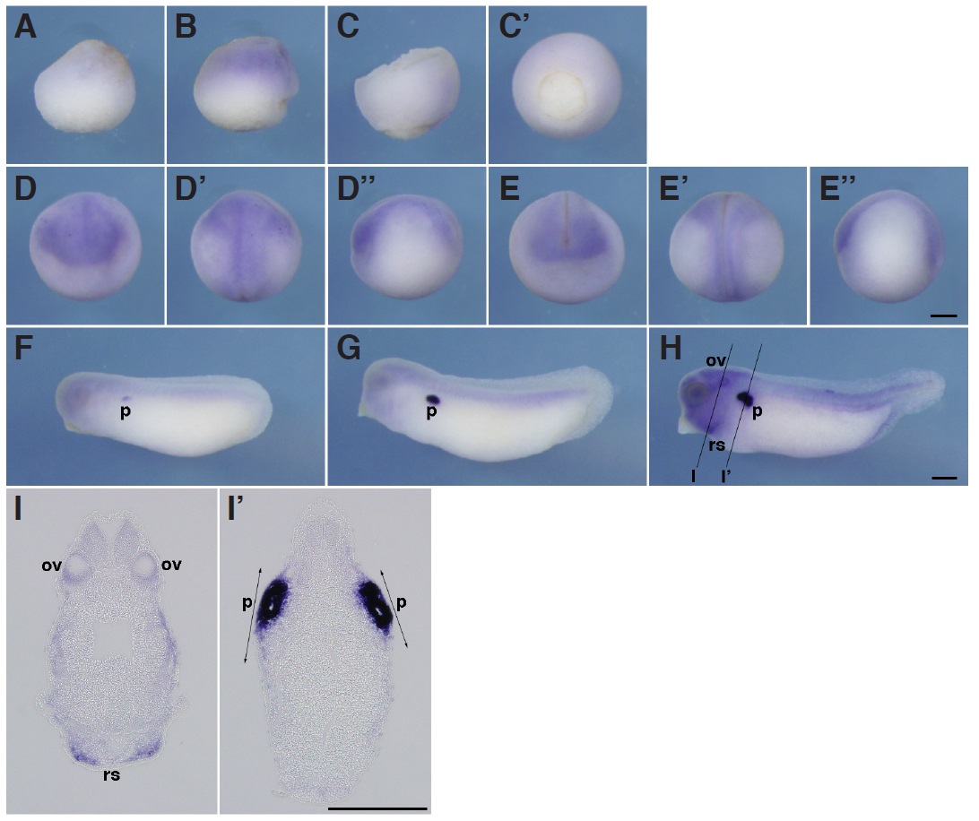 Fig. 4. In situ hybridization analysis of igfbp4 during X. tropicalis development. (A) Stage 9, (B) stage 10.5, (C, C’) stage 12, (C) lateral view, (C’) vegetal view, (D,D’,D’’) stage 15, (E,E’,E’’) stage 20, (D,E) anterior view, (D’,E’) dorsal view, (D’’,E’’) lateral view, (F) stage 25, (G) stage 30, (H) stage 35, (I,I’) transversal section of an embryo at stage 35. Positions of sections are indicated by black lines, and letters mark corresponding panels. p, pronephric tubule; ov, otic vesicle; rs, rostal lymph sacs. Scale bars indicate 200 mm.